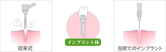 従来式がドリルで骨に穴を開け、削ってしまうのに対して、当院でのインプラント法は針の様な特殊な器具を使用します。